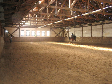 Die Reithalle wurde erst 1995 gebaut, auch wenn sie durch ihre Recyclingsteine genauso alt wie der Hof aussieht (1800). Das Klima in der Halle ist super, im Sommer kühl und im Winter friert nichts ein. Die Maße betragen 20 x 40 m.